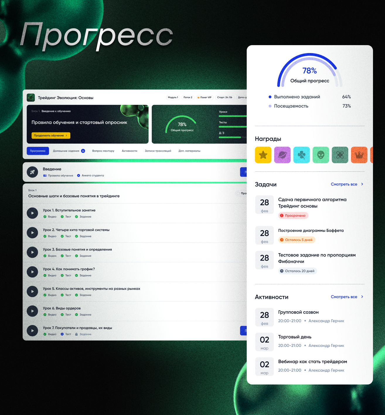 Личный кабинет, со всеми материалами, прогрессом по обучению, тестами и заданиями.